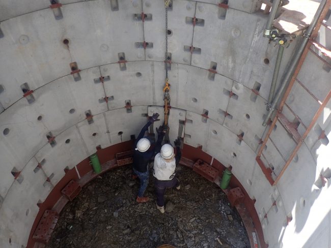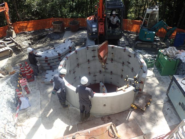 鋼製刃口をジャッキで押し込みながら掘削し、鉄筋コンクリ-ト製のセグメントを組立(張り付け)て集水井を構築していきます。